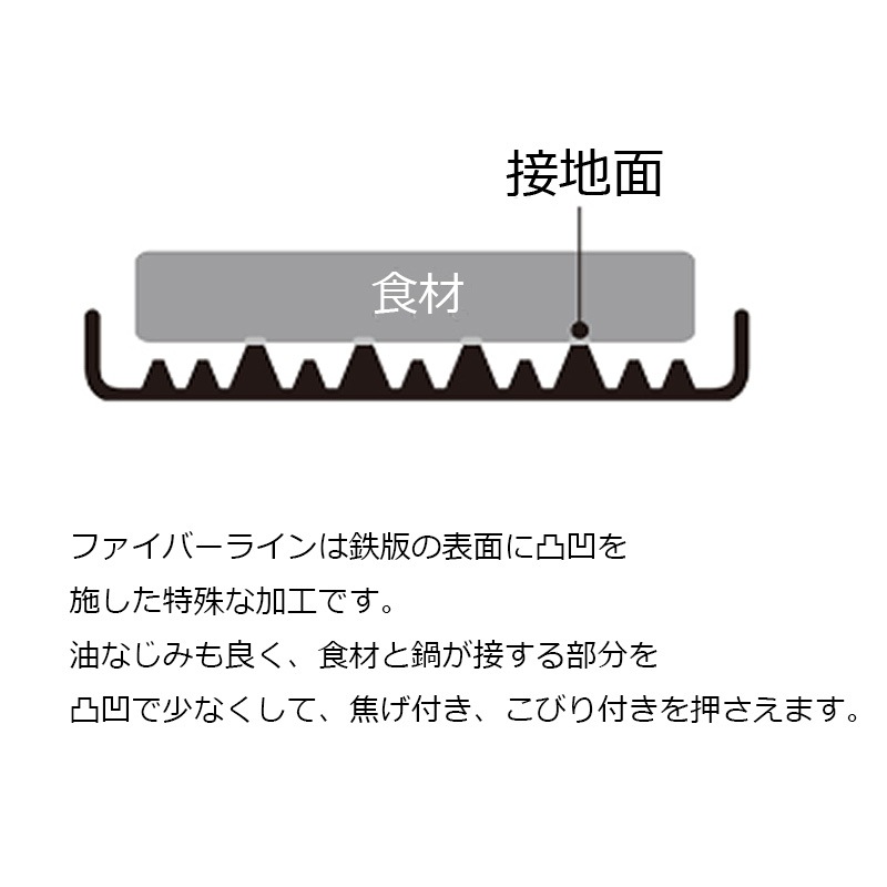 鉄製にはファイバーライン加工を施し、焦げ付き、こびり付きを抑えます。